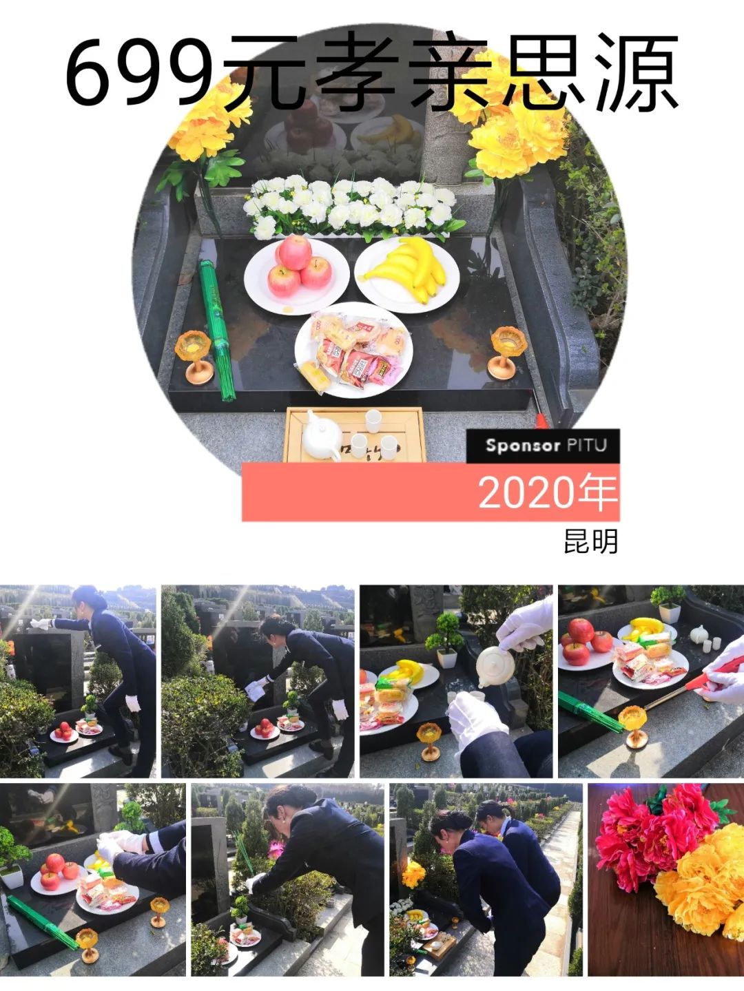 祭掃物品:擦布,高級青香1把[直接焚燒給往生者],貢品3盤(水果1盤、糕點2盤)[贈送,擺放],綠茵小盆景1對[贈送,擺放],寄語卡片,酒水,祭文